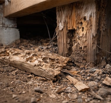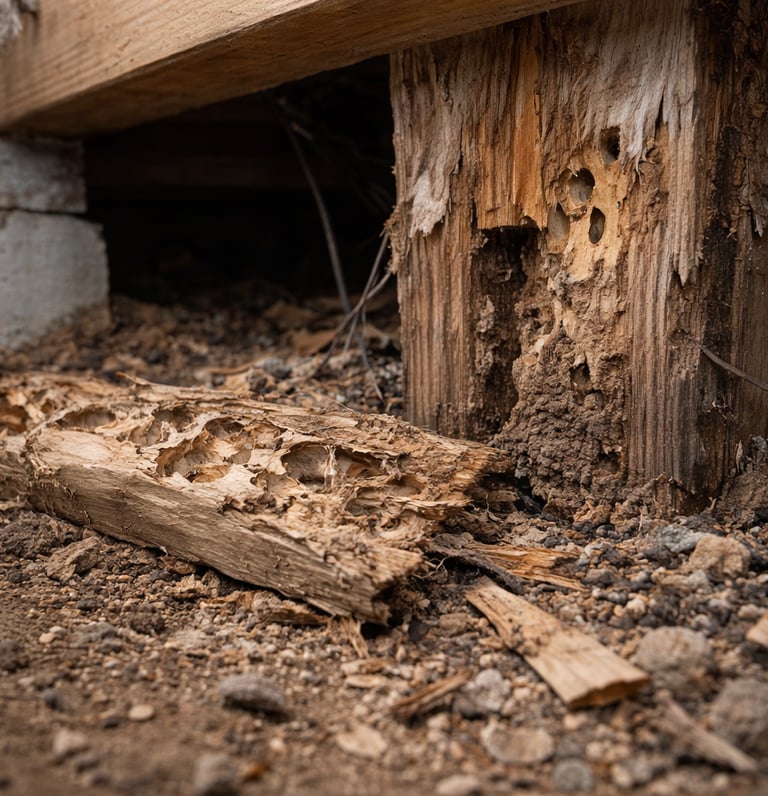 Termites can cause serious structural damage if left untreated. Once active, they continue to spread and compromise wood throughout the structure.